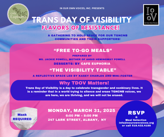 In a world trying to silence trans and gender non-confirming voices, we're here to remind you that we are thriving and cannot be erased. In honor of this year's Transgender Day of Visibility, we're holding space for our TGNC communities and their supporters. Join us for Flavors of Resistance featuring:
